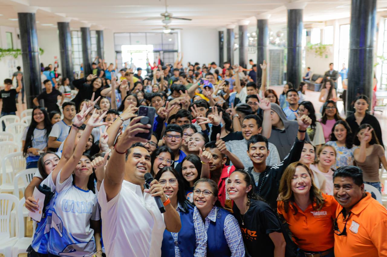 Los gritos y aplausos se apoderaron del lugar, mientras el candidato naranja, Roberto Lee, agradecía la apertura de la institución y la asistencia de los alumnos, ellos le solicitaban fotografías del recuerdo y playeras de la carita feliz.